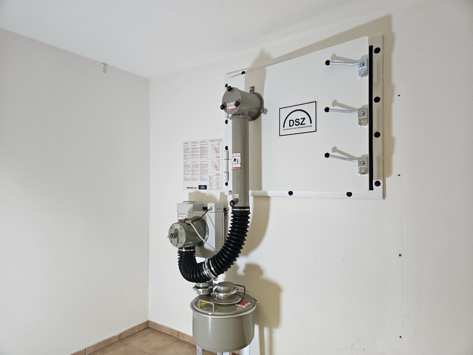 Ein geprüftes Schutzraumbelüftungssystem saugt Luft von außen an, filtert sie als Schutz gegen biologische, chemische und auch atomare Bestandteile und kann sowohl elektrisch als auch manuell bei Stromausfall betrieben werden.